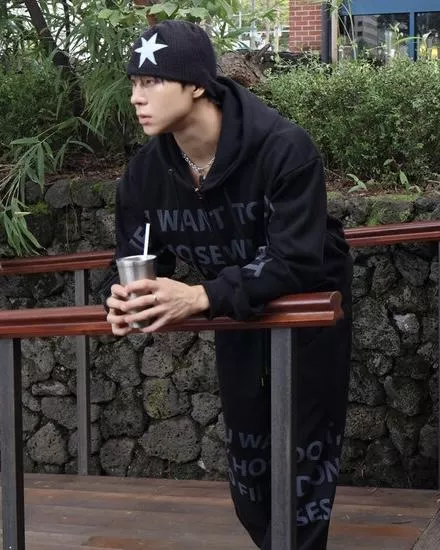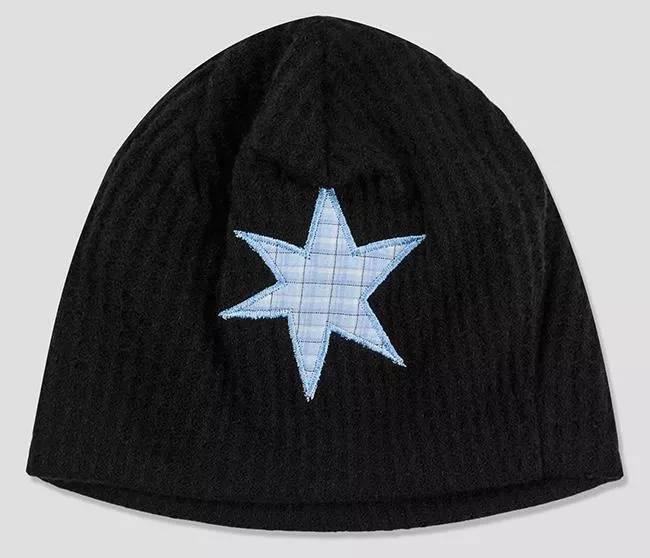 在黑色的華夫格水桶帽上繡上水藍色星星