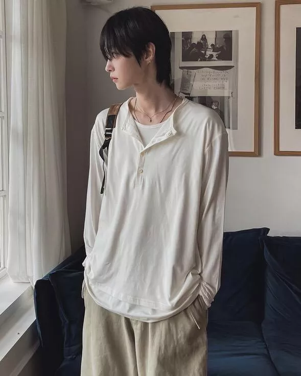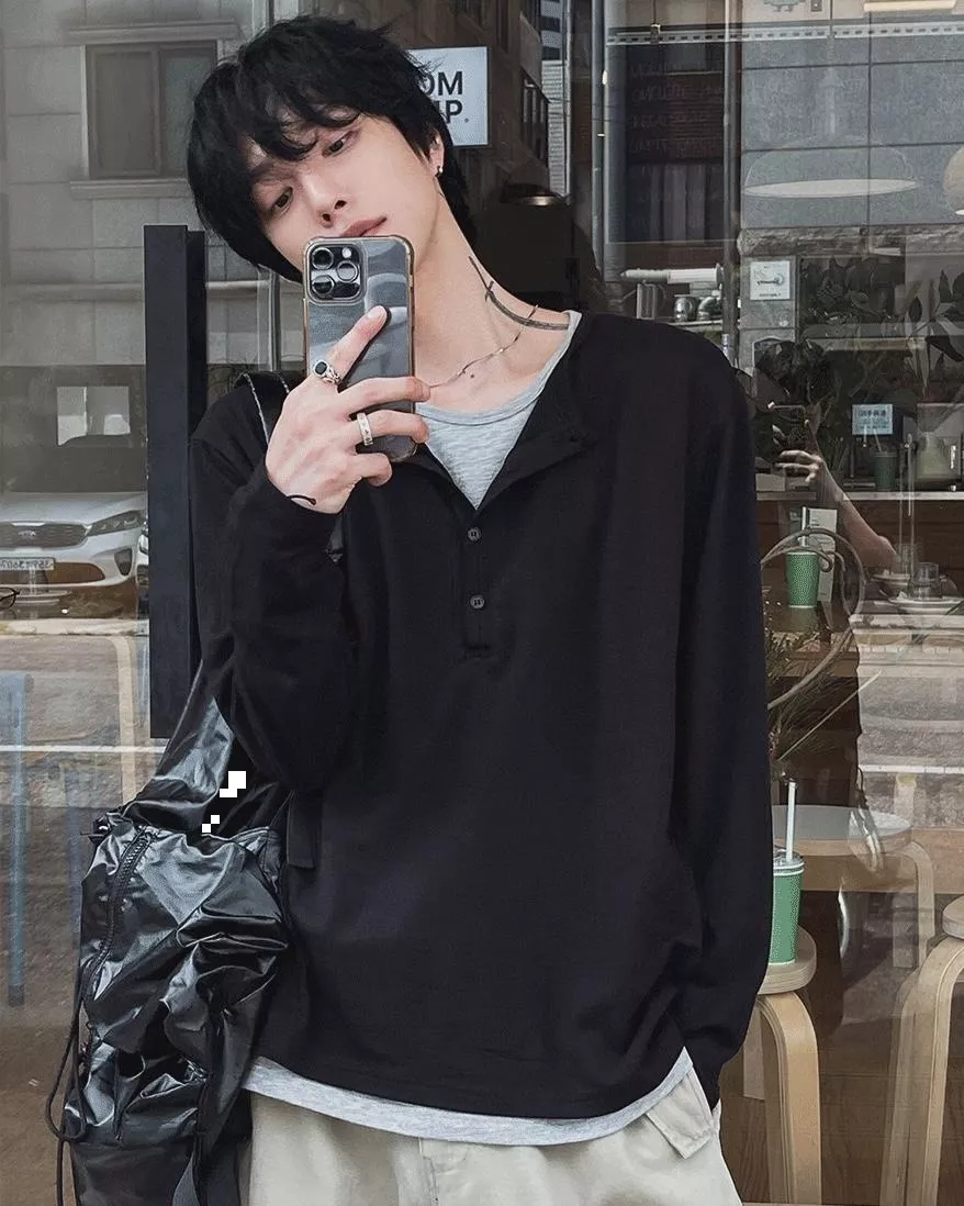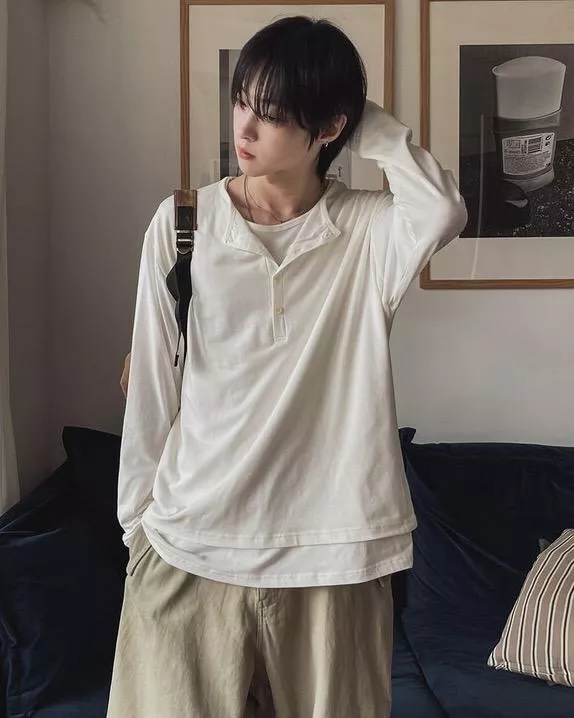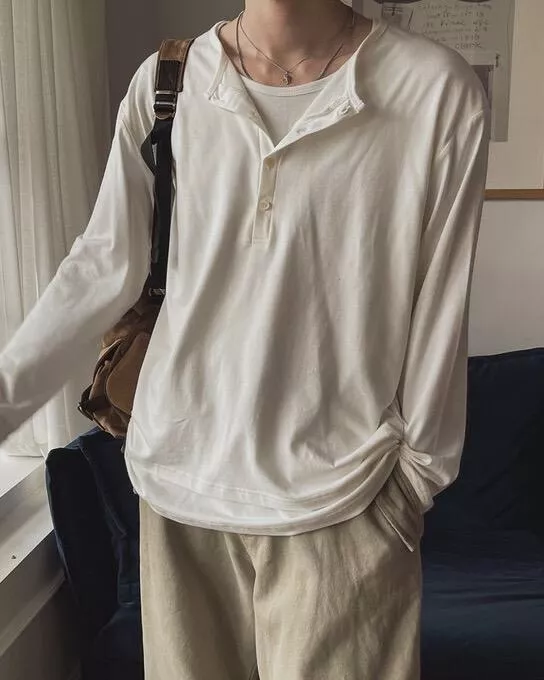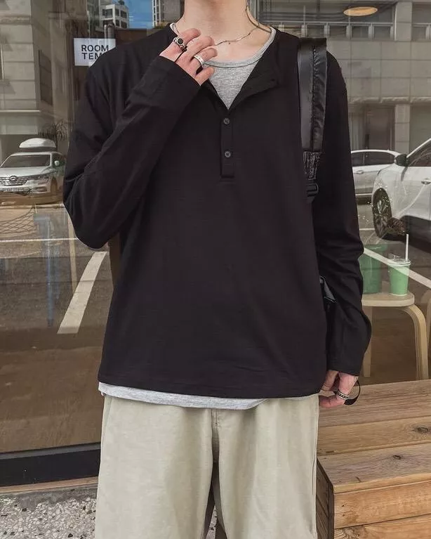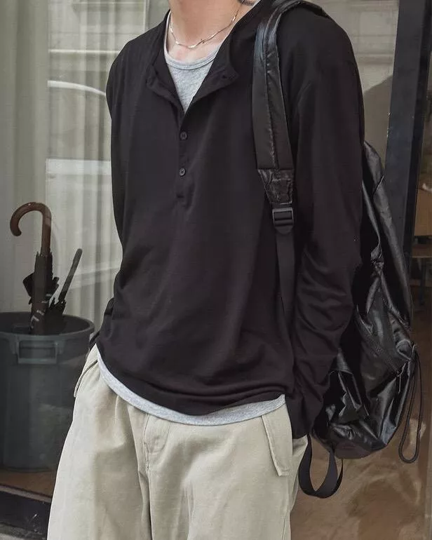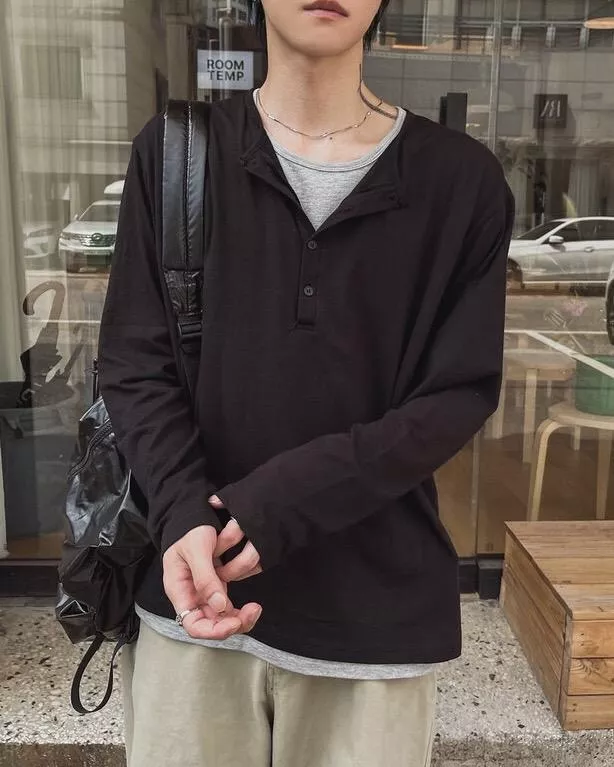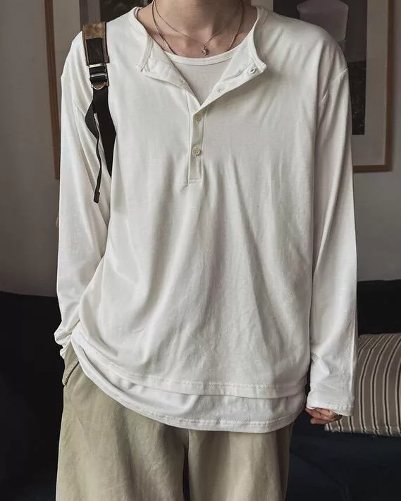 春季日常 雙色層次 亨利領薄長袖