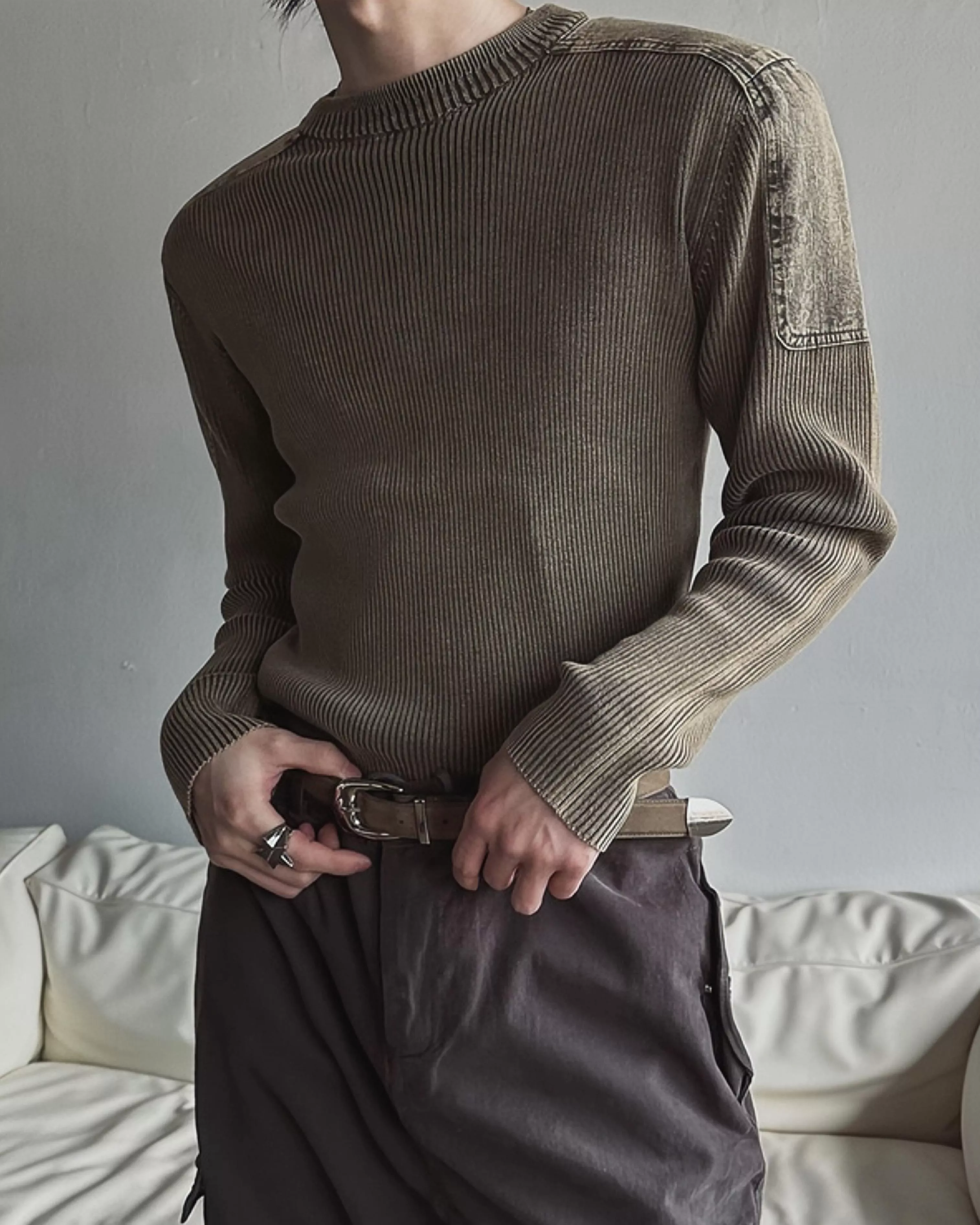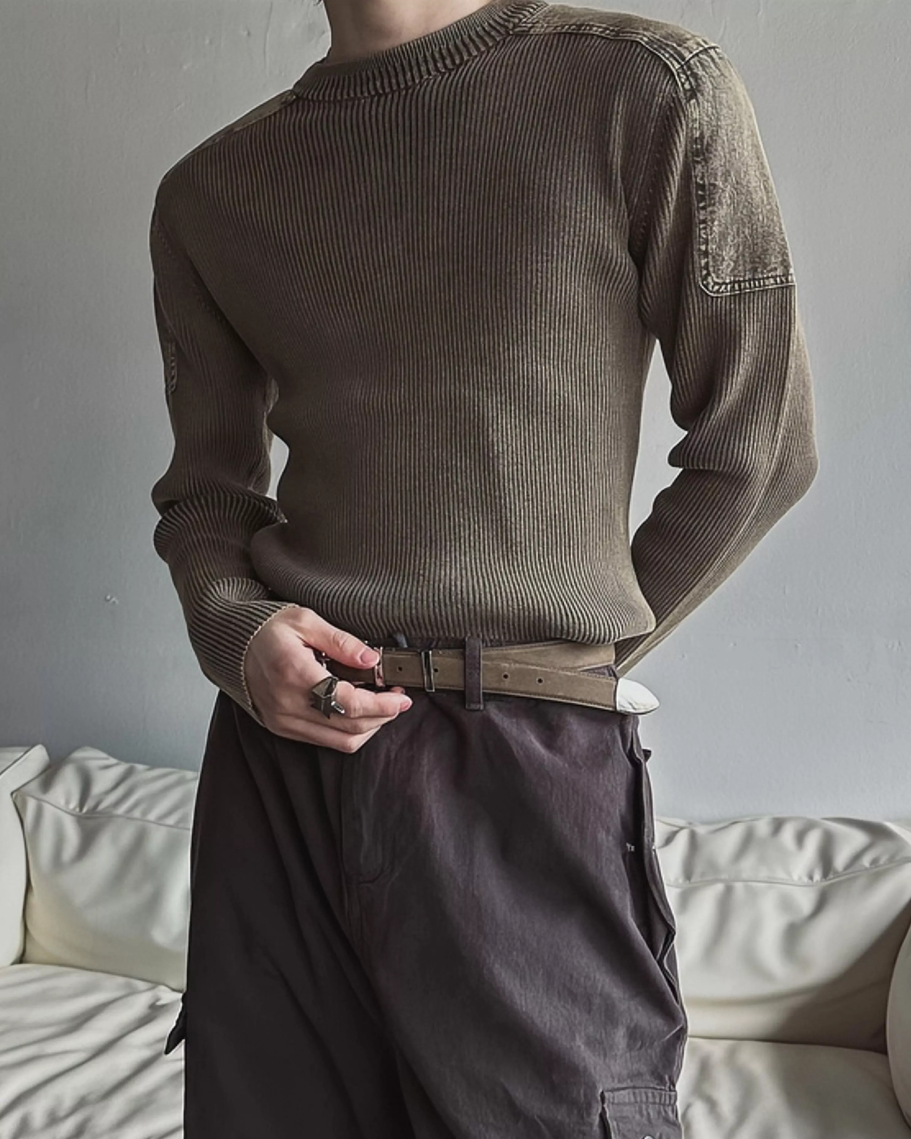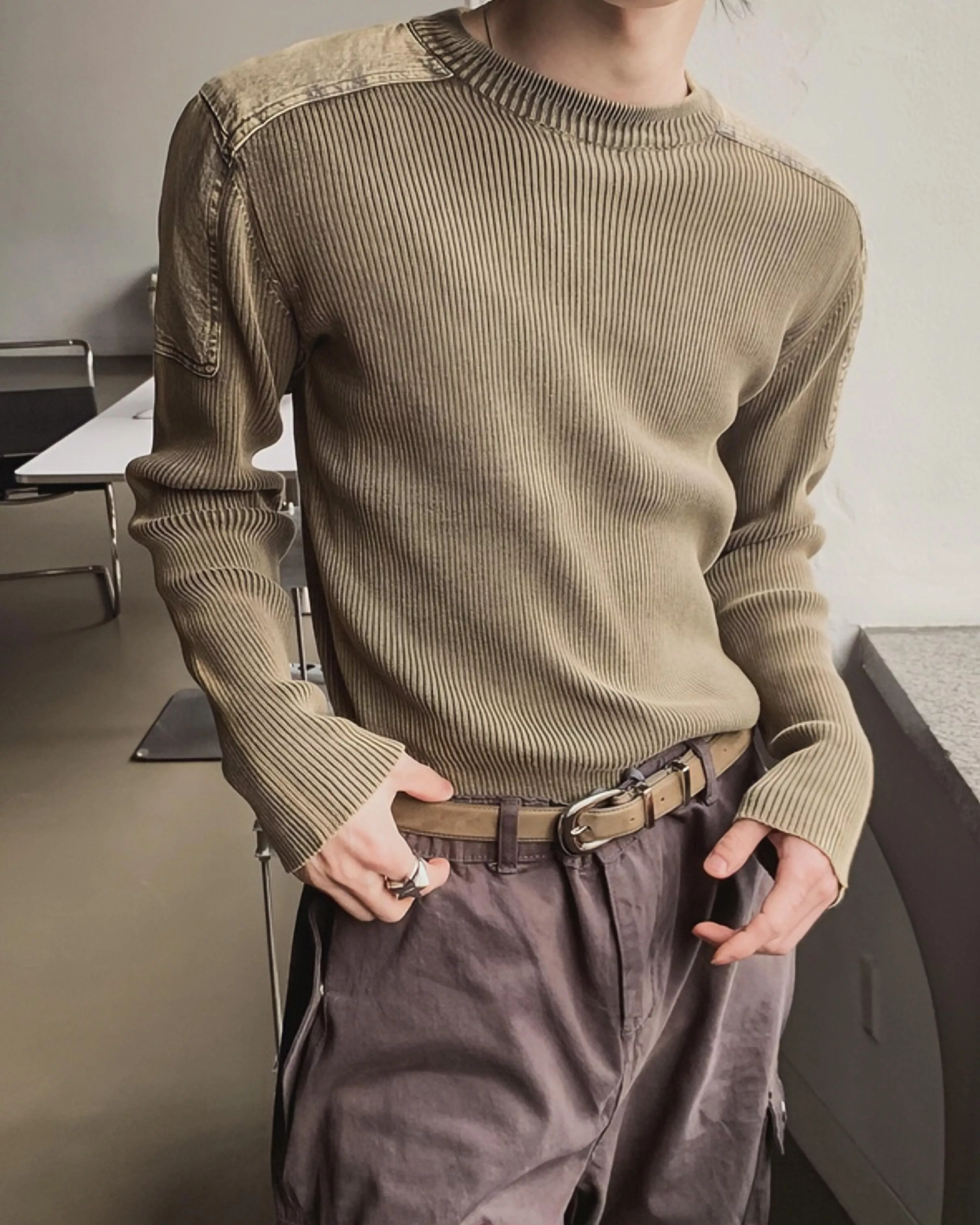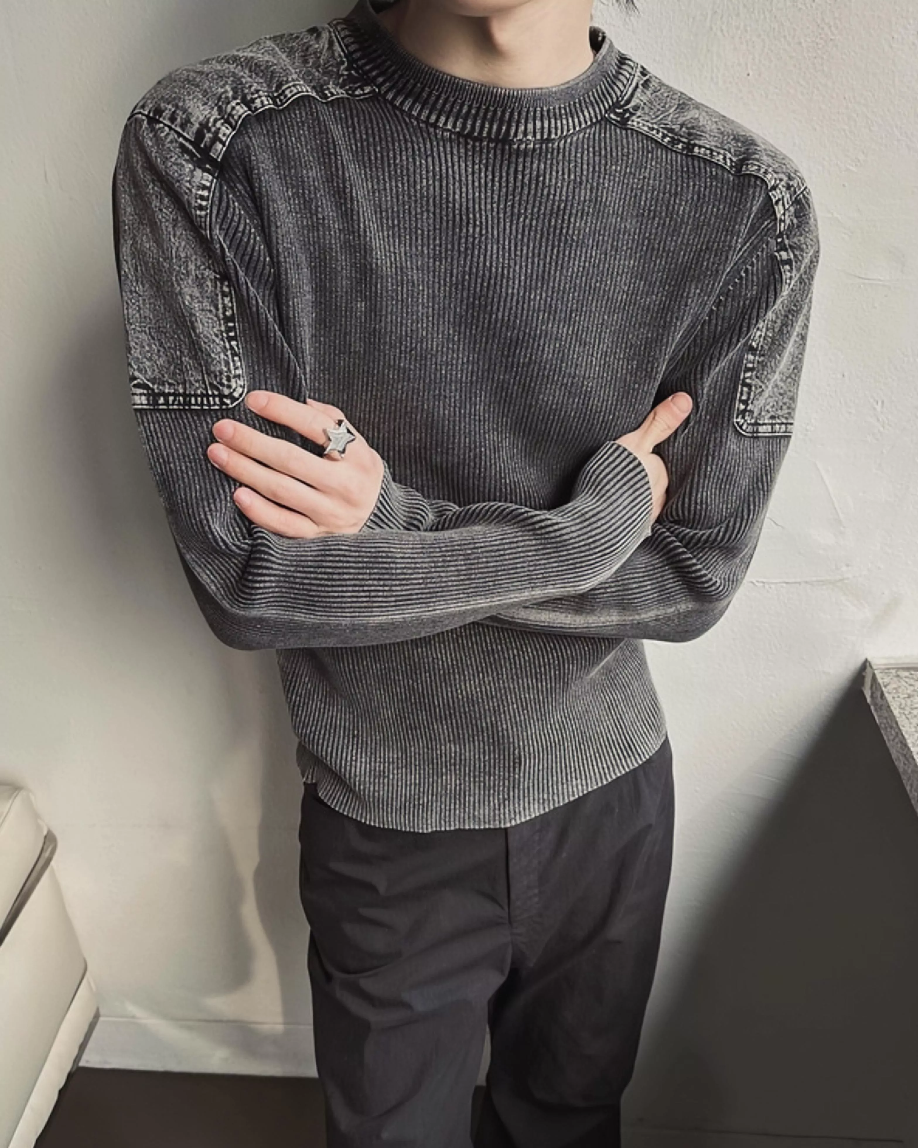 顯壯肌肉款 肩線補丁水洗高磅針織衫